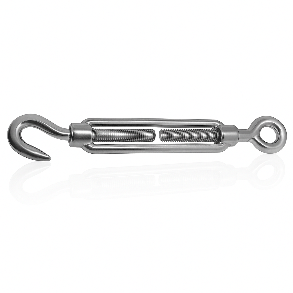 Изготавливается по стандарту DIN 1480. Конструкция: корпус с правой/левой резьбой, один конец — крюк, второй — кольцо. Используется вместе с коушами DIN 6899, зажимами тросовыми DIN 741 и стальными канатами соответствующего диаметра.